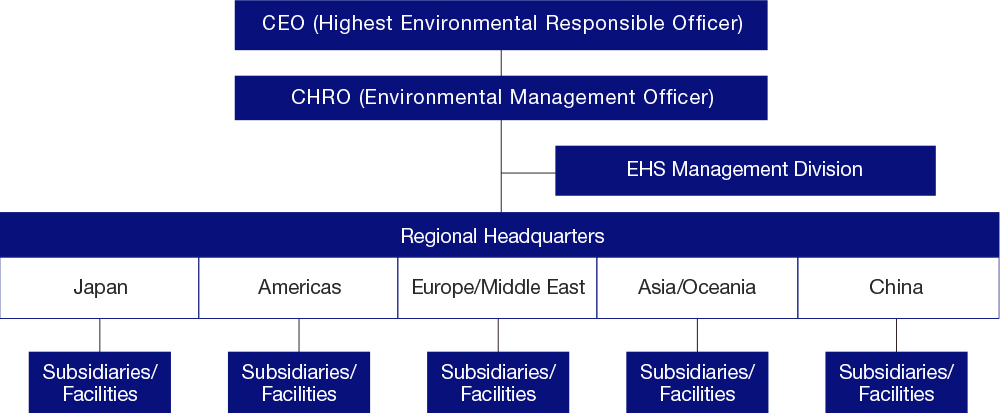 In the Olympus Group, the CEO is appointed as the top executive officers for the environment. Also, and the CHRO (Chief Human Resources Officer), who manages human resource development and general affairs including matters related to the environment, health and safety (EHS), serves as the top management for environmental affairs for the entire Group. The EHS management division formulates the Environmental Health and Safety Policy, and also plans and implements environmental measures and monitors environmental initiatives across the entire Group, such as the progress of energy reduction targets and implementation status of environmental measures, under the direction from CHRO. In addition, environmental management divisions have been established at each business site and Group company, and the EHS management division is responsible for environmental management for the entire Group. Since FY2015, the EHS management division has created and operated an information platform for the entire Group to enable efficient gathering and sharing of information on environmental initiatives at various global sites that are essential to environmental management, as well as environment-related data and the status of these sites in complying with laws and regulations.