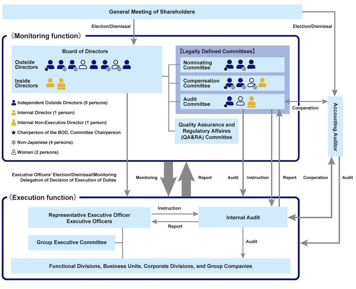 To ensure the soundness of management, Olympus is strengthening its functions of information disclosures and monitoring. Additionally, since 2011, the company has been working to enhance its management oversight function, through the separation of management oversight and execution. Our corporate transformation plan, named “Transform Olympus” and launched in 2019, has involved Olympus transitioning in fiscal 2020 from a Company with an Audit & Supervisory Board, to a Company with a Nominating Committee, etc.