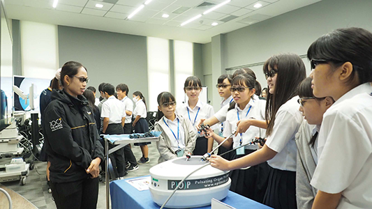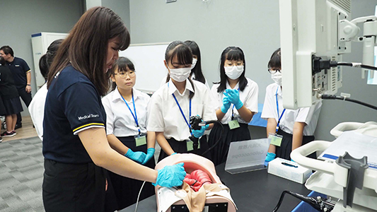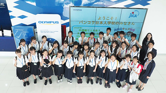 | Event Outline | In partnership with the Thailand Office of the Japan International Cooperation Agency (JICA) and the Thai-Japanese Association School of Bangkok, Olympus hosted the school's third Endoscope Kids Class. As in the previous two years, the class was offered in line with the school's educational syllabus on Japan's ODA (Official Development Assistance) initiatives, and was designed to familiarize students with how Japan's medical technology contributes to solving the health and medical challenges faced by Thailand. Through a lecture given by Olympus staff and a visit to Olympus T-TEC (Thai - Training and Education Center), the students learned about the mechanisms and roles of endoscopes and the importance of early detection for treating cancer. The students also got a chance to operate endoscopes, surgical laparoscopes and treatment devices specifically built to help train medical professionals. The students' interest in the medical field only grew stronger as they struggled during their first experience with these rarely seen devices. Olympus remains committed to providing learning opportunities to young people, who will one day shape our future, through programs that utilize the products Olympus creates for the benefit of society. |