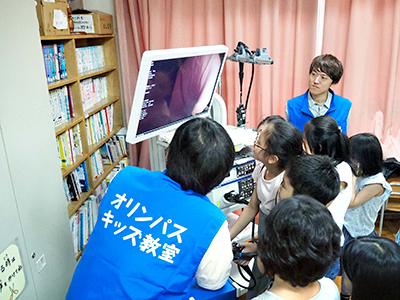 | Event Outline | Olympus held the Endoscope Kids Class for 30 children at the Nishihara Elementary School's after school club in Shibuya Ward. Olympus employees gave children lectures about the role and history of medical endoscopes, and also supported the experience of operating real endoscopes and treatment tools. The children were curious about the endoscope they were seeing for the first time, and through this event they deepened their understanding of Olympus and endoscopes. Participated children expressed their impressions such as "It was interesting to know in detail how the endoscope was born" and "I want to tell my family about the endoscope". |