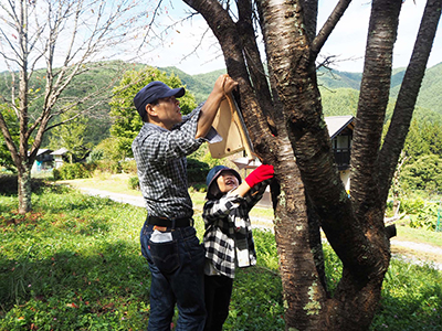 | Event Outline | In support of the Adopt-A-Forest Program promoted by Nagano Prefecture, Olympus' Nagano Facility concluded an adopt-a-forest partnership agreement with the Forest Owners' Cooperatives of the towns of Tatsuno and Monzen in 2014, and has held the local environmental conservation event "Komorebi-No-Sato" ever since. The 11th Komorebi-No-Sato event attracted about 160 Olympus employees and their families, who worked together to pick up broken branches and thin trees to avoid overcrowding and improve the growth of the remaining tress. Parent-and-child teams also set up nesting boxes for birds. In addition, there was a photography workshop for employees' families, with participants adding their drawings to the photographs they took for enhanced effect. |