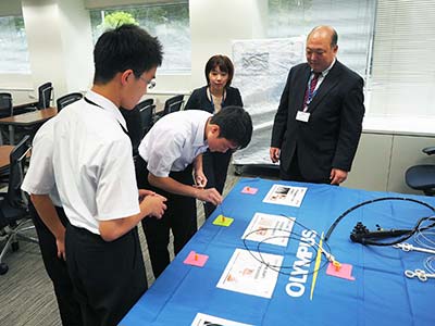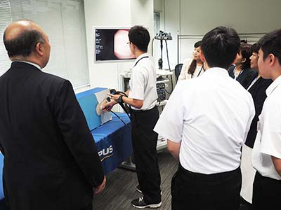 | Event Outline | The Olympus headquarters in Tokyo welcomed students from Kyowa Junior High School in Daisen, Akita Prefecture and held an Endoscope Kids Class for them. The students had demonstrated strong interest in medicine and other scientific fields as potential future career paths and wanted to visit Olympus, and in response a company visit was arranged as part of the students' graduation trip to Tokyo. The students were first briefed on Olympus and the many uses of endoscopes, followed by a hands-on experience with endoscopes and other instruments, as well as a tour of an area showcasing microscope products. Post-visit responses from the students were very positive. A student pursuing a career in the medical field appreciated the opportunity to actually hold medical devices, and another student even stated that the visit had renewed their interest in Olympus products, and that they would love to work for Olympus one day. |