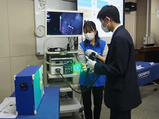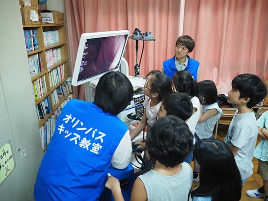 To help students learn about endoscope that contributes to maintaining our health through the early detection and treatment of cancer, we offer classes in cooperation with educational institutions and schools as part of cancer education and the period of integrated studies. The role of endoscope, prevention of cancer, and the history of endoscope are explained to elementary school students in an easy-to-understand manner through lectures and operation experience of endoscopes.