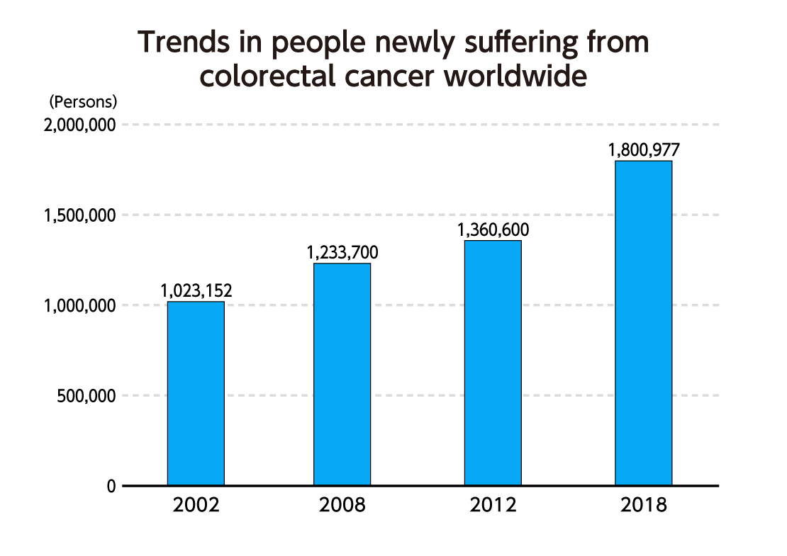 The number of new cases of colorectal cancer is increasing annually throughout the world. From approximately 1.02 million in 2002, the number of new cases of colorectal cancer globally increased to approximately 1.8 million in 2018; therefore prevention and treatment for colorectal cancer have become important challenges.