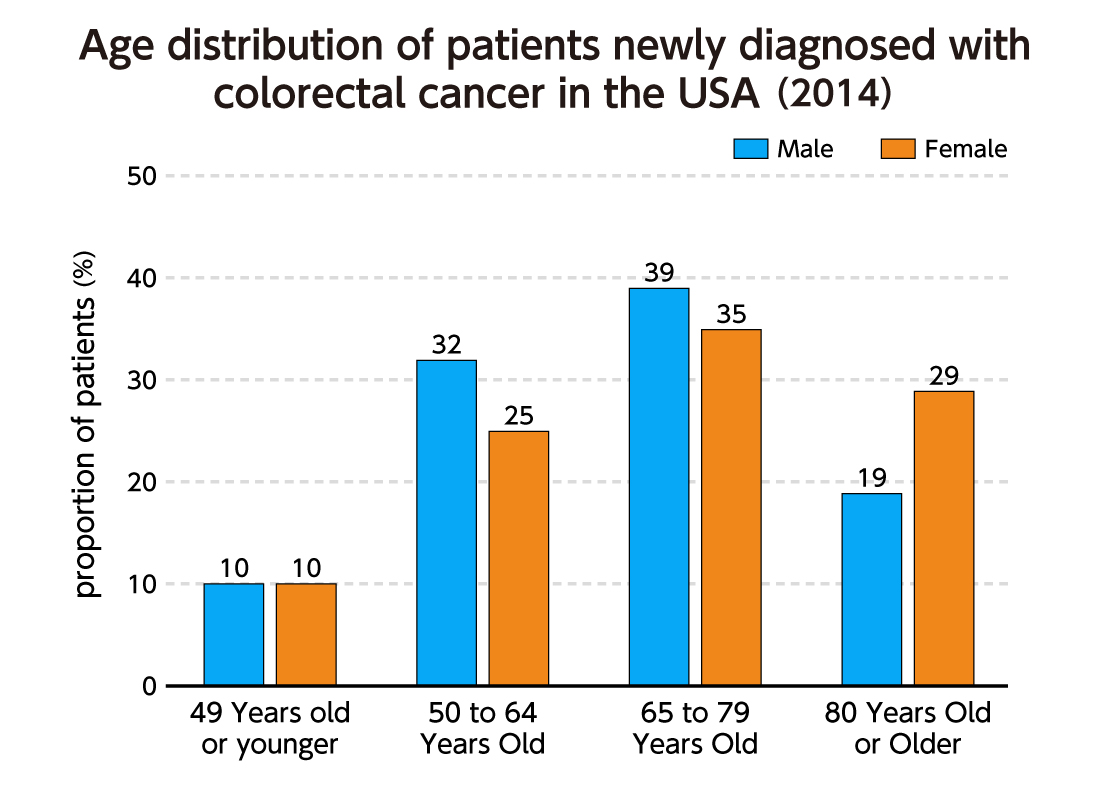 Since US statistics show that the number of persons newly diagnosed with colorectal cancer is increasing greatly among both men and women aged 50 or older, the risk of developing colorectal cancer is thought to increase with age.