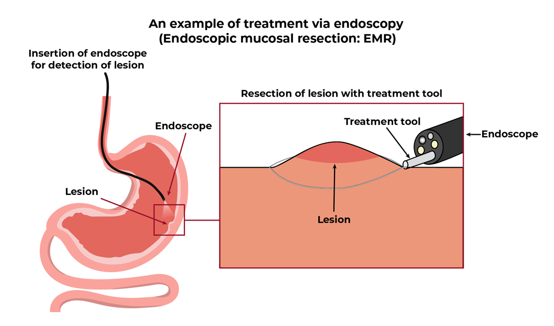 Treatment of stomach cancer is typically based on stage and spread of stomach cancer. When stomach cancer is detected in its early stages, endoscopic resection is a common mode of treatment. As endoscopy does not require open surgery of abdomen, it can reduce the burden on the patient. In cases of advanced cancers, commonly used modes of treatment include surgery, chemotherapy, molecular targeted therapy, radiation therapy, and immune therapy (to target the immune system). As early detection and treatment of stomach cancer ensures better survival, early detection is of utmost importance.