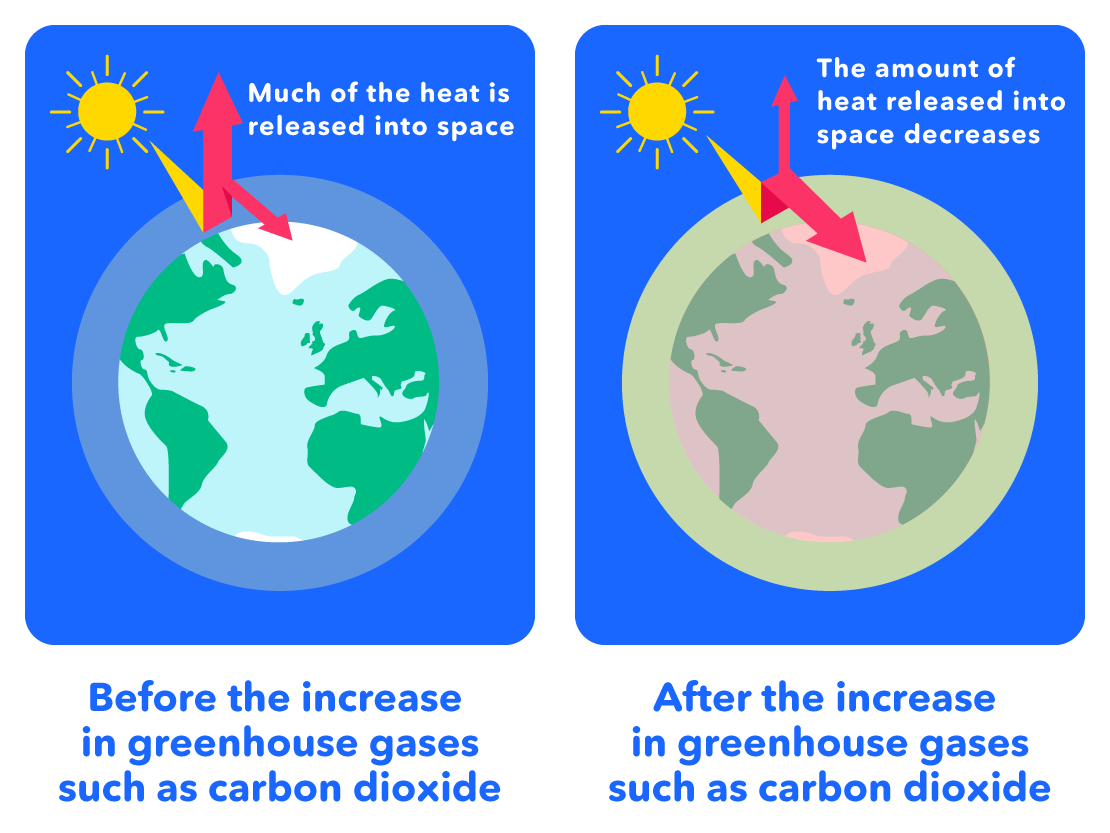 There are layers of air around the earth, and sunlight from the sun passes through these layers of air and warm the earth's ground. Much of the heat released from the warmed ground is released into space. Also, some of this heat is absorbed by what is called "greenhouse gases" that are in these air layers, like carbon dioxide, which warm the air. However, if the amount of carbon dioxide increases too much, the amount of heat absorbed also increases, keeping the heat on the earth. This is said to be the cause of global warming.