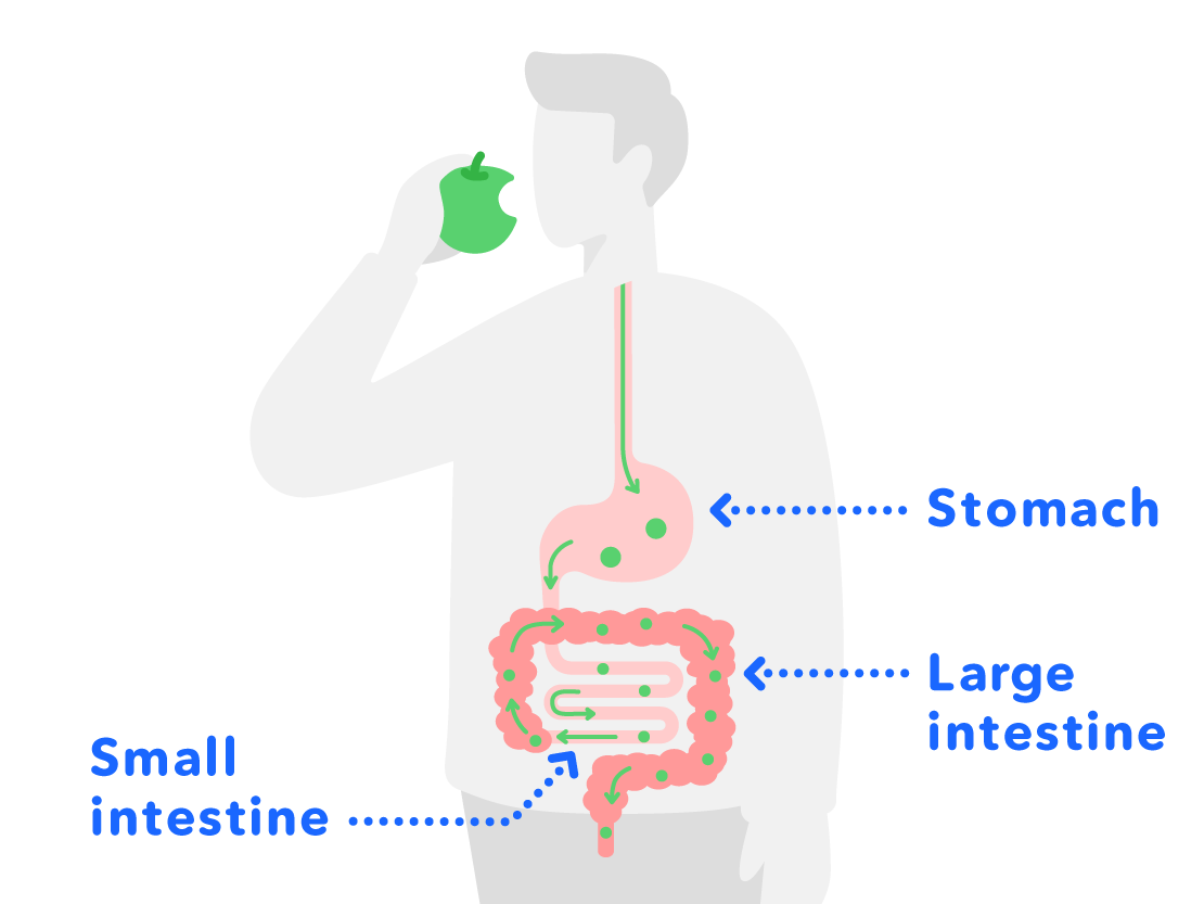 Food which comes in through the mouth is digested in the stomach, and nutrition is absorbed in the small intestine, etc. and moisture is absorbed in the large intestine, before it is discharged through the anus.