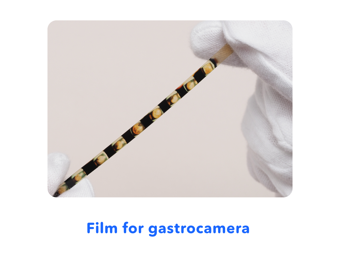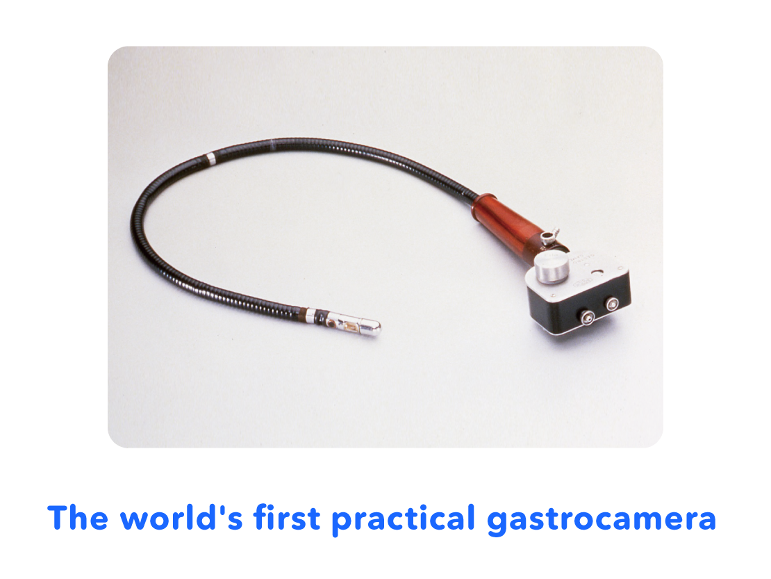 The gastrocamera had a camera lens and flash on the tip that was swallowed. The inside of the stomach could be filmed by pressing the shutter button on the device outside of the stomach. Images were recorded on film, which was developed after the examination*, allowing the inside of the stomach to be checked.