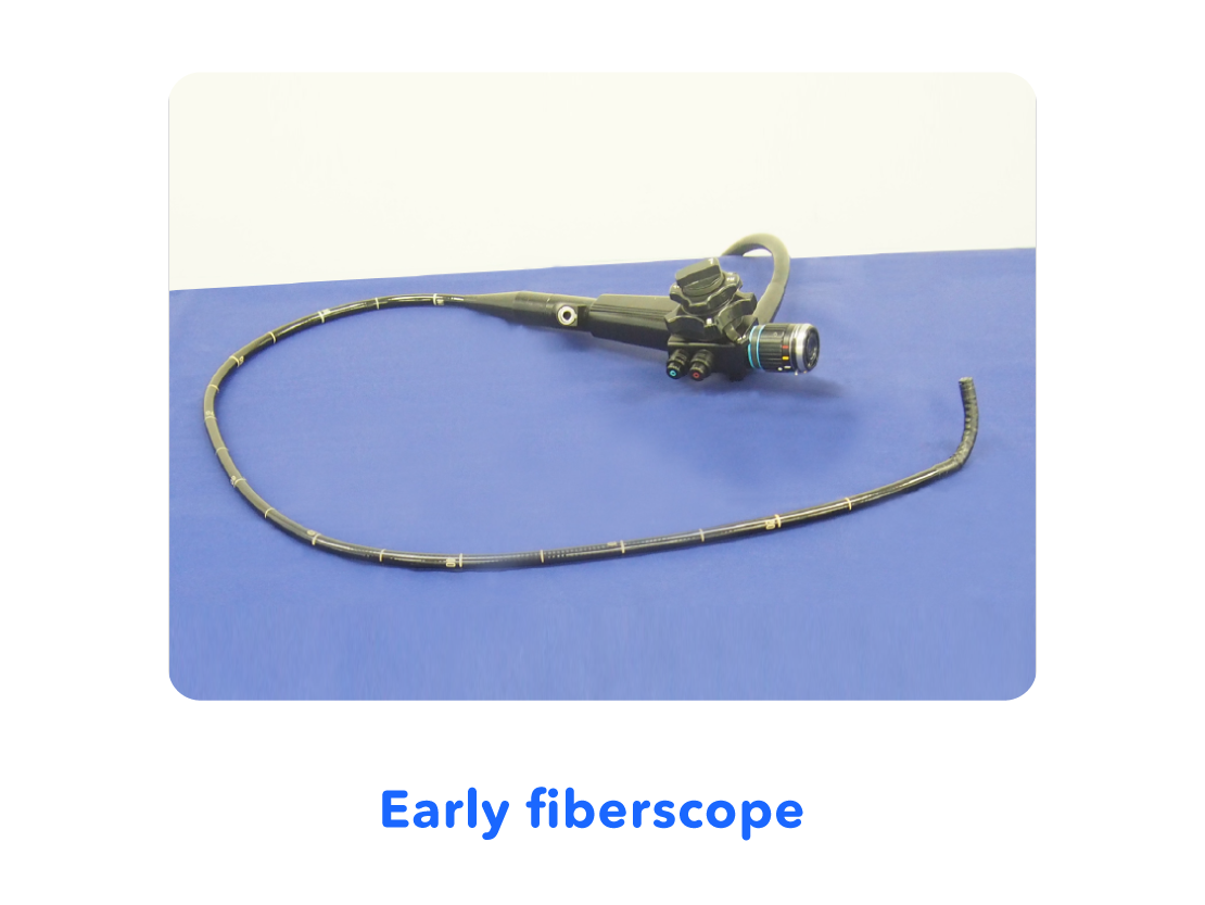 In the 1960s, the "fiberscope" emerged, which used a material known as glass fiber. Glass fiber played the role of a long lens which could be bent and convey light from one end to the other end. By using a bundle of these glass fibers, the fiberscope allowed the inside of the stomach captured at the tip of the scope* to be seen at the other end. This "fiberscope" made it possible for doctors to see inside of stomachs immediately, during their examination.