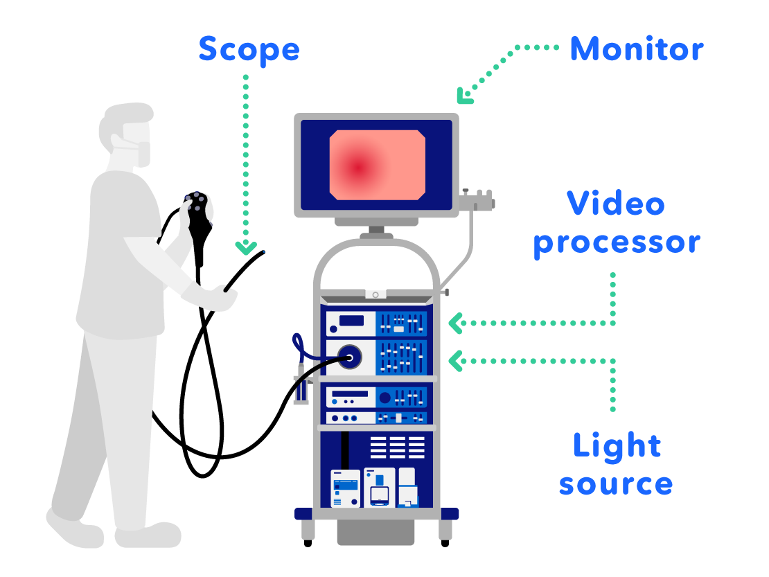 Endoscopes are a combination of different devices. Firstly, the system consists of a video processor which processes the images taken with the tip of the scope inside of the abdomen and displays them on a monitor.