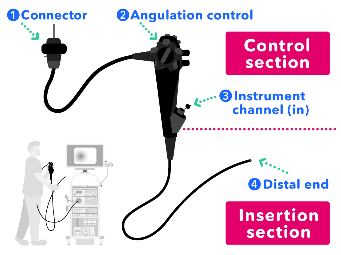 Treatment tools which are placed into the instrument channel (in) at the grip of the scope pass through the instrument channel and come out of the instrument channel (out) at the distal end of the scope.