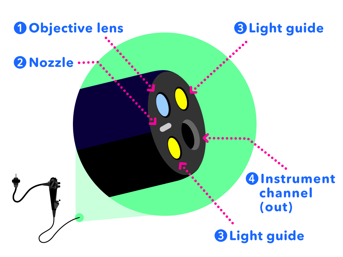 - Instrument Channel (Out): treatment tools come out through the instrument channel