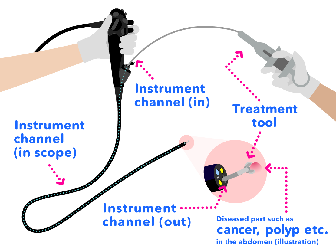 Inside of the scope is a tunnel-like part called the "instrument channel" which is used for the treatment tool to pass through. There are many different kinds of treatment tools, depending on the application.