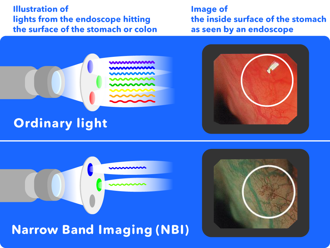 When the specific light of the NBI hits the surface of the stomach or colon, it can easily show groups of capillaries which can be difficult to see with normal light. Because cancer obtains its nutrients through blood vessels, blood vessels are thought to collect around cancers. NBI makes it easier to see these collections of blood vessels, supporting doctor's examinations and allowing for the early detection of cancer etc.