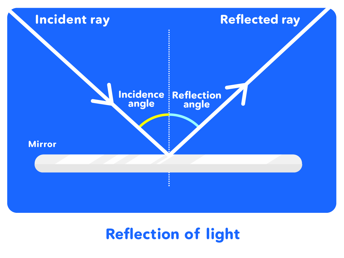 First, let's learn about the characteristics of "light" that are crucial when getting knowledge about the mechanism of lenses. One of the characteristics of light is the ability to travel in a straight manner and bounce off in a different direction when hitting an object such as a flat mirror. This phenomenon is called reflection. When light is reflected, the incidence angle, which is an angle of the light coming in, and the reflection angle, which is an angle of the reflected light, are equal.