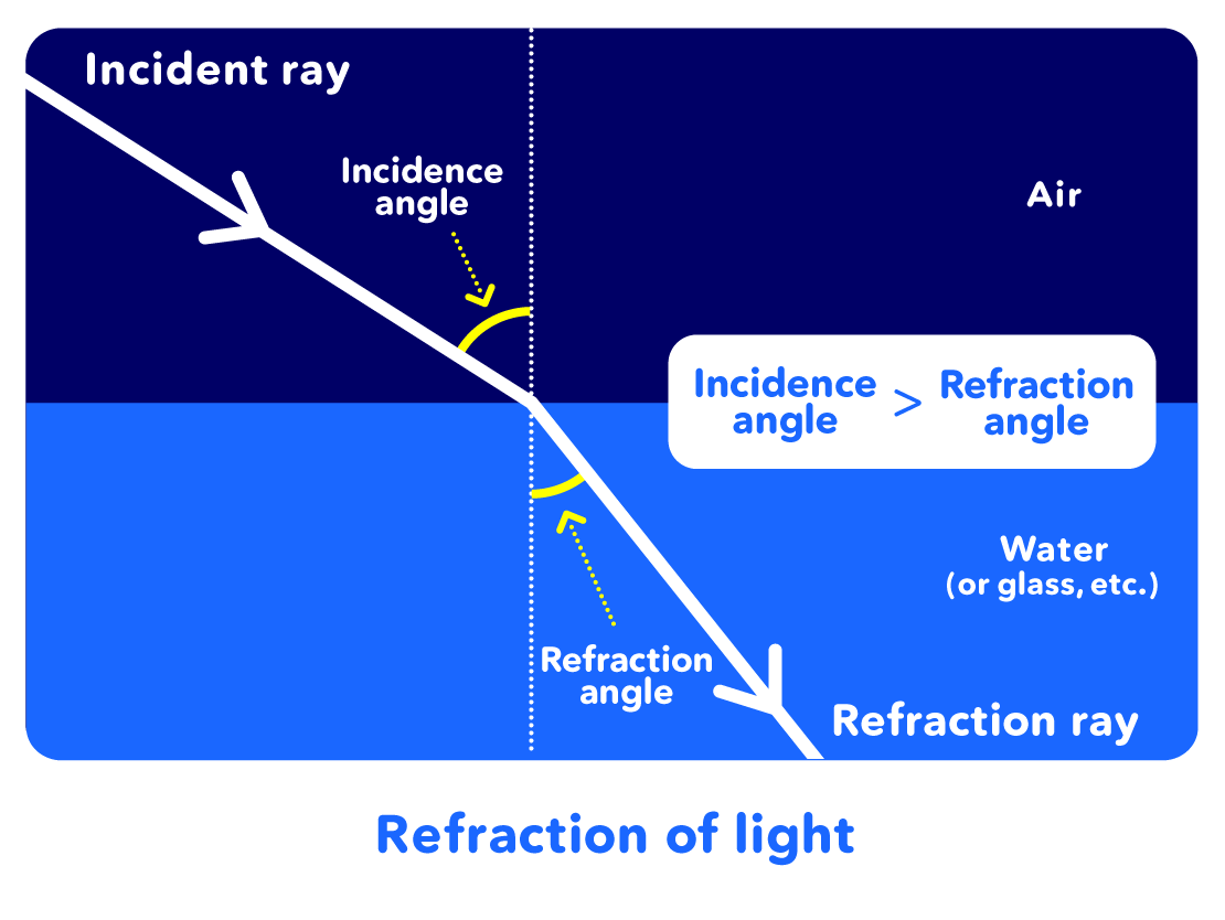 The speed of light is slower in glass or in water as compared to its speed in air. Consequently, when light travels from air into a different substance obliquely, the traveling direction changes at the boundary. This phenomenon is called refraction. For example, when light enters a water surface from air, the incidence angle is bigger than the refraction angle. In contrast, when light travels from water into air, the incidence is smaller than the refraction angle.