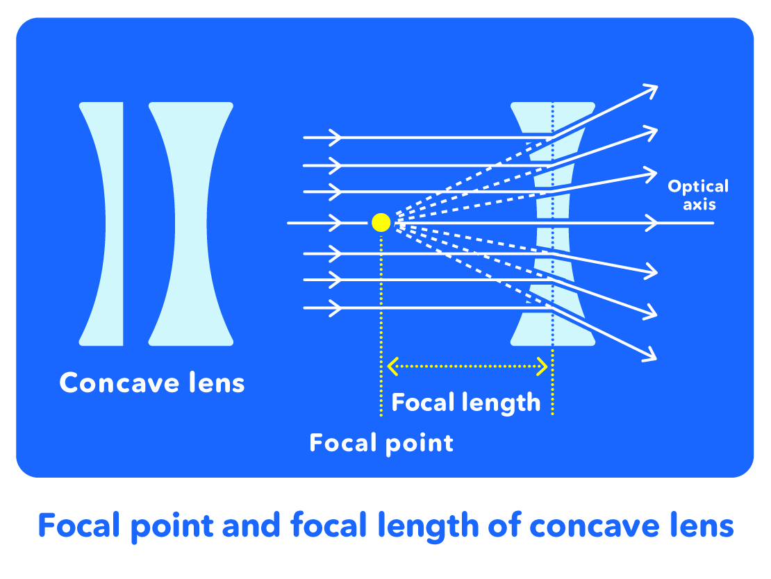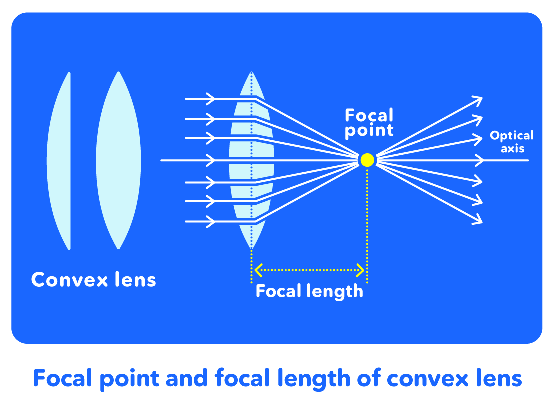 A point where bundles of rays are converged after being refracted through a lens is called a focal point. In concave lenses, the focal point is an extension of the beams of spreading light in a reverse direction. The distance between the lens and the focal point is called focal length. This distance varies depending on the thickness of the lens and the curve of the lens surface. In microscopes, cameras, and telescopes, the focal length is adjusted by combining convex and concave lenses, enabling you to see small objects magnified or to see something far away as if they are close by.