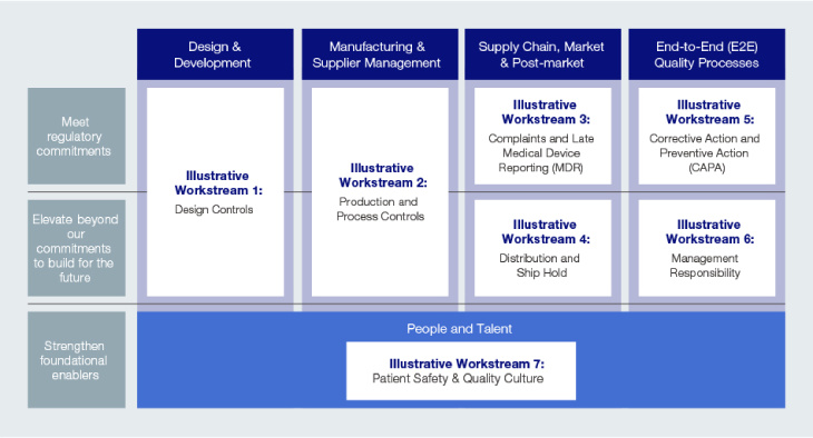 Elevate comprises 20 workstreams, driven by a strong team selected globally from each function. The four pillars of “Design & Development,” “Manufacturing & Supplier Management,” “Supply Chain, Market & Post-Market,” and “End-to-End (E2E) Quality Processes” will drive our efforts to meet regulatory commitments and strengthen the foundation of our quality culture.