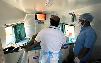 One measure that has already started is an initiative with the Asian Institute of Gastroenterology (AIG), a leading medical institution in Hyderabad, India. Under this initiative, a van travels one to two times each month to distant villages located up to 100 km from the base hospital and performs endoscopic screenings as well as basic blood screenings. The screening data is transmitted via satellite communications to the AIG main hospital in Hyderabad the same day for diagnosis. The following day, the physician who traveled to the site can prescribe therapeutic drugs.