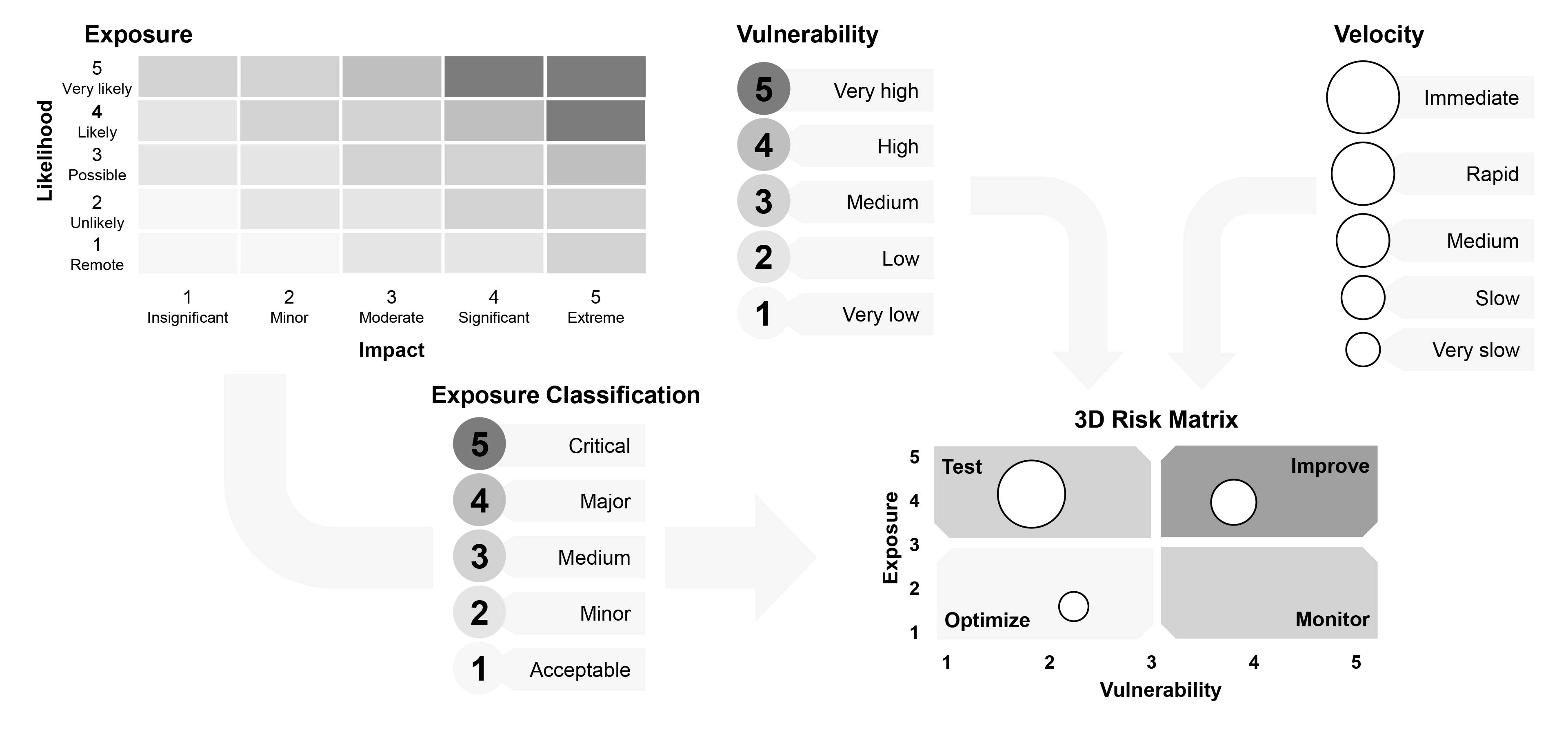 - Exposure which is determined by likelihood and impact. The likelihood indicates the probability of a risk materializing, while the impact assesses the severity of the consequences if a risk does materialize. Likelihood and impact levels are defined as quantitative (financial) or qualitative criteria.