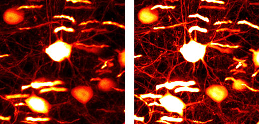 Image of a nerve cell in the brain (depth: 600 µm, without compensation [left], with compensation [right])