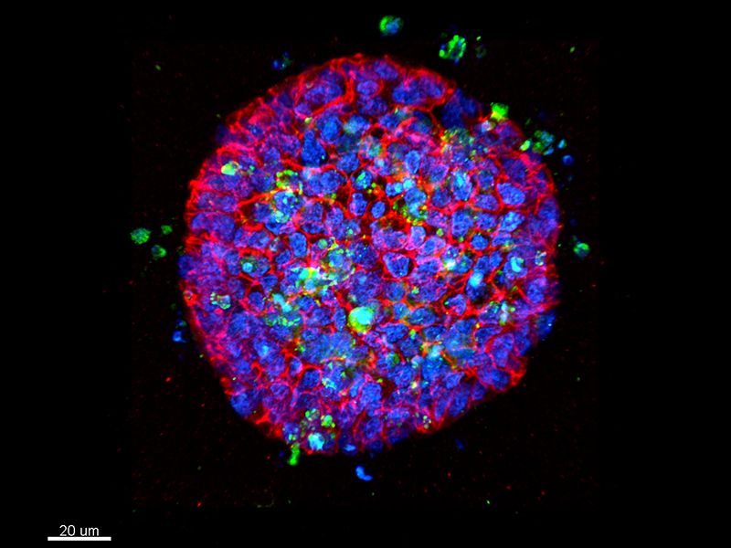 Dead cells (both green and blue labeled) are detached from organoids. 3D organoid culturing - at the USC-Olympus Innovation Partnership in Multiscale Bioimaging – enables more true-to-life testing of anticancer drugs on patient-derived tumor samples in order to determine a personalized treatment regimen.
