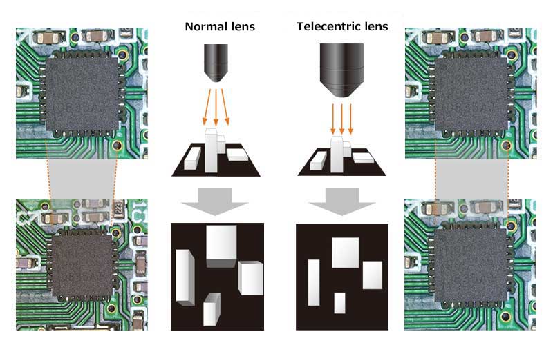 Comparing images captures with and without a telecentric optical system