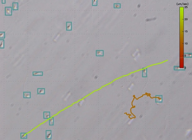 Example calculation of sperm motility (green: fast, red: slow)