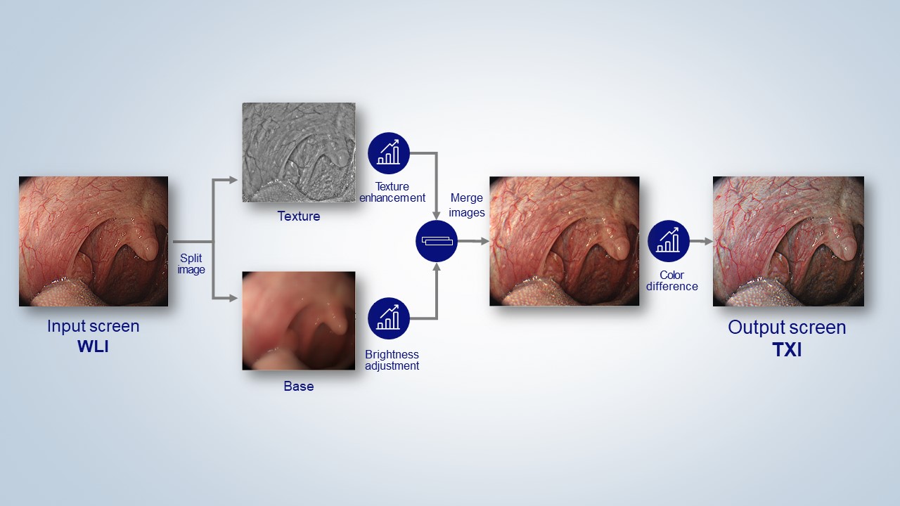 TXI is one of the unique technologies featured in EVIS X1, Olympus’ latest endoscope system. It was launched in 2020 with the aim of contributing to early detection, diagnosis, and minimally invasive treatment of gastrointestinal diseases such as cancer. This imaging technology optimizes the structure, color, and brightness of mucosal surface images under white light imaging observation. By recognizing subtle changes in color and structure of the endoscopic images in real-time, which are difficult to be observed under white light imaging, it is expected to contribute to enhancing the observation performance for suspicious tissues related to diseases such as gastric cancer and colorectal cancer.