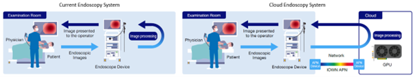 This demonstration experiment combined the advanced technology of Olympus’ endoscopes with NTT's high-speed, low-latency APN technology aimed at realizing real-time endoscope video processing in the cloud (Figure 1).