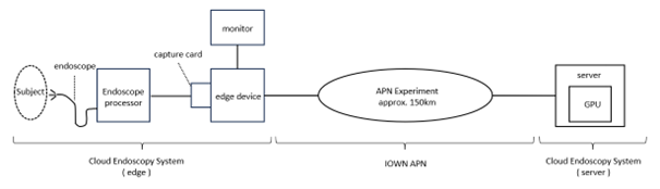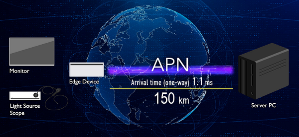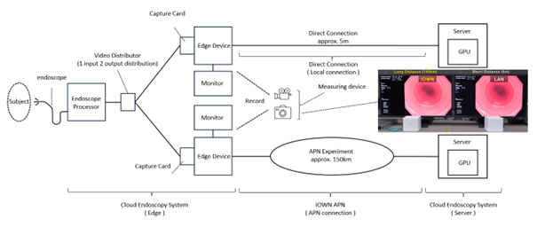 In this joint demonstration experiment, we connected a video processing server (“server”), distanced 150km away from the device that inputs endoscopy images (“edge device”), to the APN and configured it as the cloud endoscopy system (Figure 2).