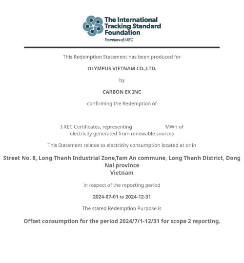 TOKYO, July 1, 2025 - Olympus Corporation (Olympus), a global MedTech company committed to making people’s lives healthier, safer and more fulfilling, today announced that Olympus Vietnam Co., Ltd. (OVNC), an Olympus group company, has achieved 100% renewable energy usage for the period from July 2024 to March 2025. This achievement is verified through the International Renewable Energy Certificate (I-REC), an internationally recognized certification administered by the International Tracking Standard Foundation