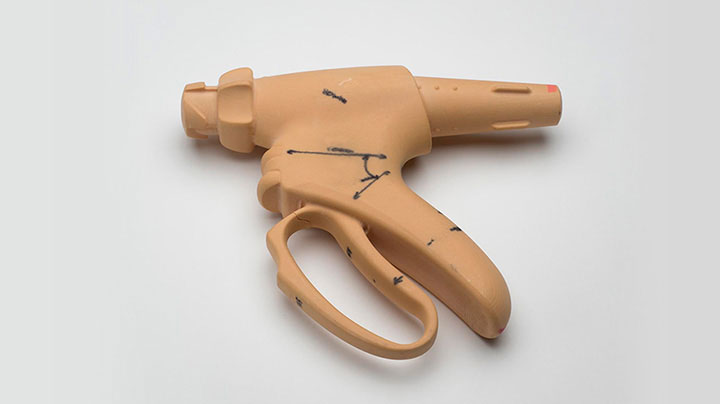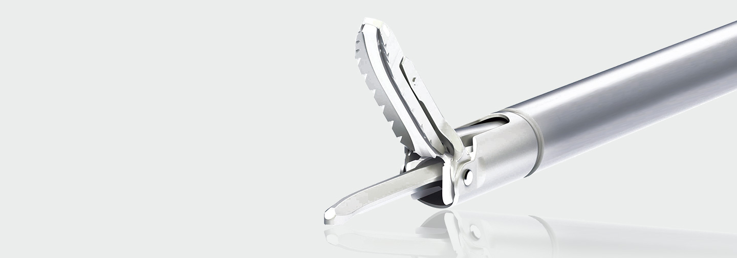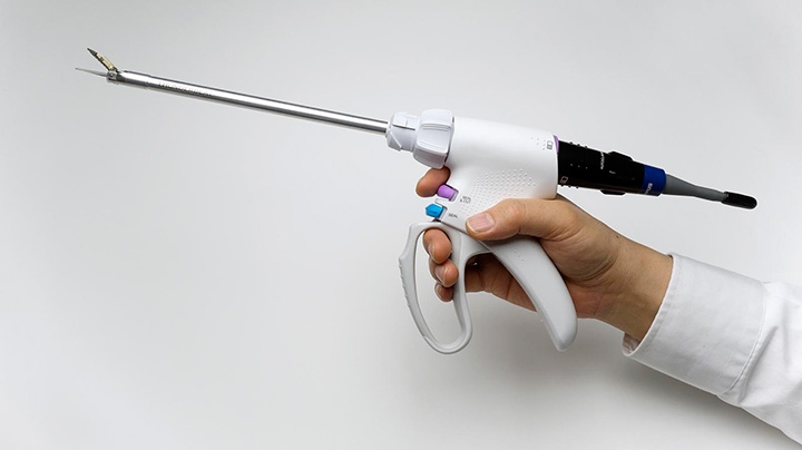 Even the angle of the handle is highly significant. The pistol-type device is available in two versions, one for laparoscopic surgery and one for open surgery. The shapes appear to be the same, but in fact the handle angles are slightly different to ensure optimal user-friendliness with respect to the procedural differences between laparoscopic and open surgeries.