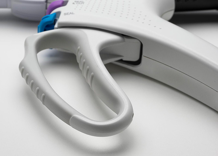 For certain other surfaces, however, we intentionally made them extra smooth. For example, while the trigger of the open-surgery device is both rubberized and texturized on its inner edge and part of its outer edge for flexible control, the lower outer edge was made extra smooth without using rubber. We chose this design after confirming that a rubberized trigger surface can unintentionally grab the surgical drapes and interfere with the surgery. For the laparoscopic-surgery device, moreover, the trigger's entire outer edge is non-rubberized because of the greater chance of contacting surgical drapes in such surgeries. Every detail, no matter how small, was carefully considered prior to finalizing any design.
