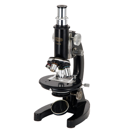 Total magnification ranged between 50x and 1500x. The GC was widely used at universities, hospitals, and research laboratories for general medical or biological applications, as well as at teaching laboratories for practical sessions. The GC featured the same revolving stage as the GK and could be used with a binocular head.